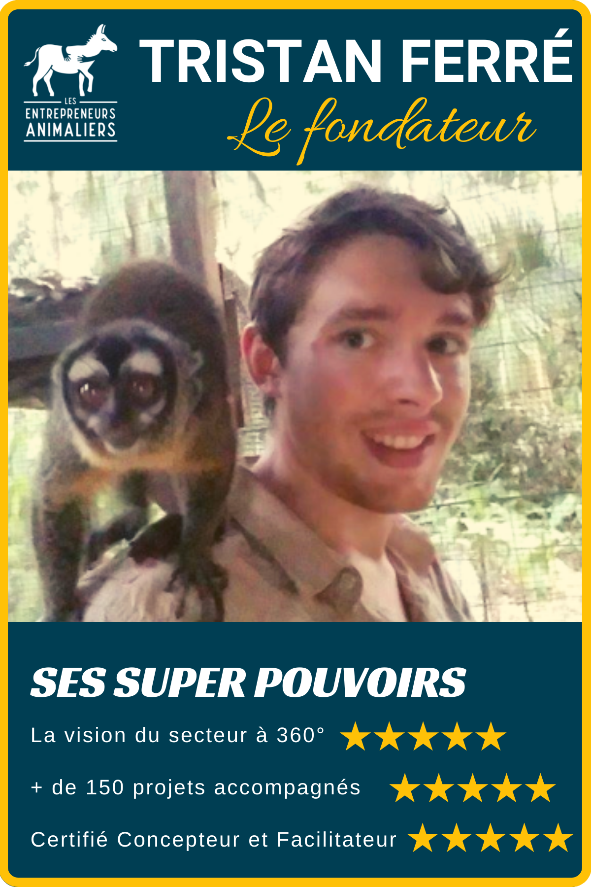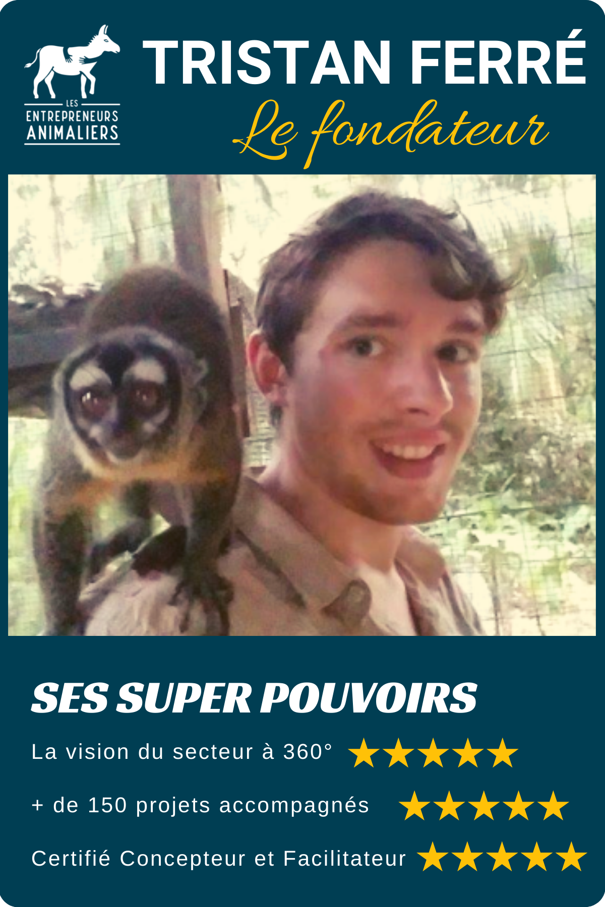 Tristan FERRE a grandi à la croisée des chemins entre, d’une part, le monde médico-social (il vit près de 10 ans au sein d’un EHPAD dans lequel sa mère est gardienne et aide-soignante), et le monde animal.